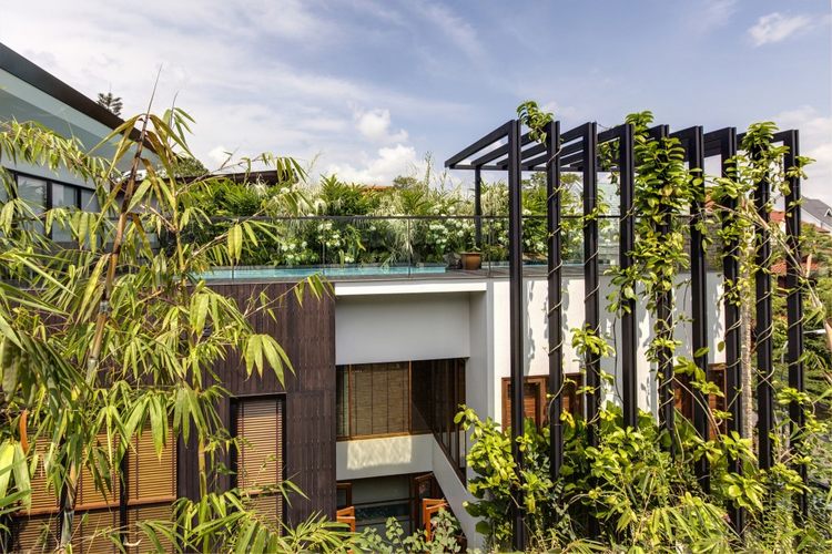 他的兩個兒子現在也已經十幾二十歲了,他們需要更大的空間和隱私。因此建筑師在住宅的空間上進行了有趣的安排,在男孩的房間外設置了一條游廊,從地面一直延伸到屋頂,孩子們可以通過游廊直接到達屋頂的娛樂室和泳池花園平臺。這個住宅跟前兩棟住宅所用材質相似,也用了非常天然的木材、大理石、花崗巖,與蒼翠繁茂的垂直花園相輔相成。