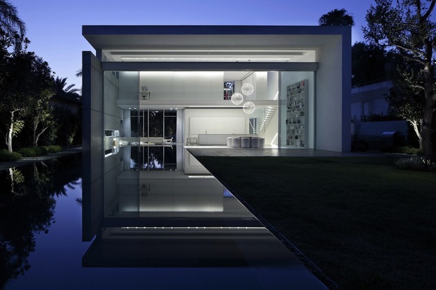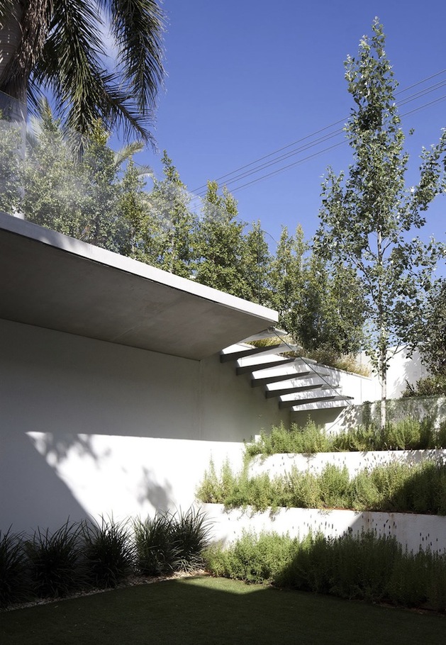 別墅裝修設計白色現代簡約別墅設計以色列建筑師Pitsou Kedem別墅外觀上用橫平豎直的矩形,白色外墻漆,大面積的落地玻璃向院子開放,院子圍墻很好的保護了隱私性,室內分為前后兩部分,在后方,是個開放的公共空間,用以日常活動和社交聚會,在前面,是對著大門入口的臥室,主人套房占據了三樓整層。內部裝飾也是以白色為主調,連地面也是接機白色的淺灰,只用了少許布藝,地毯增色,整個建筑內外都透出一種優雅,高貴的氣質。